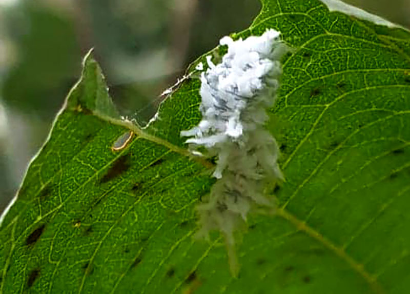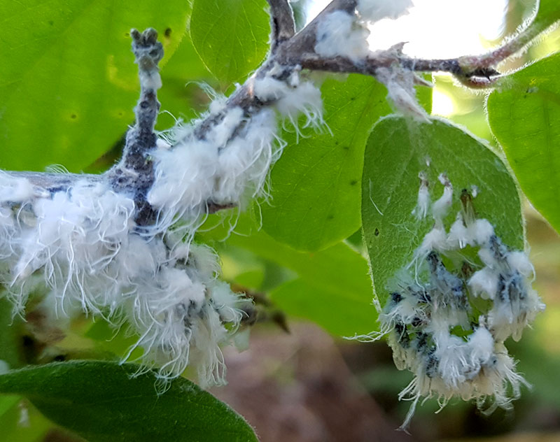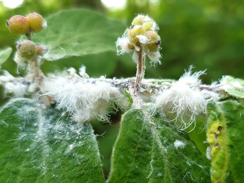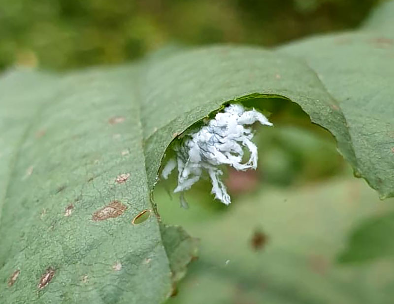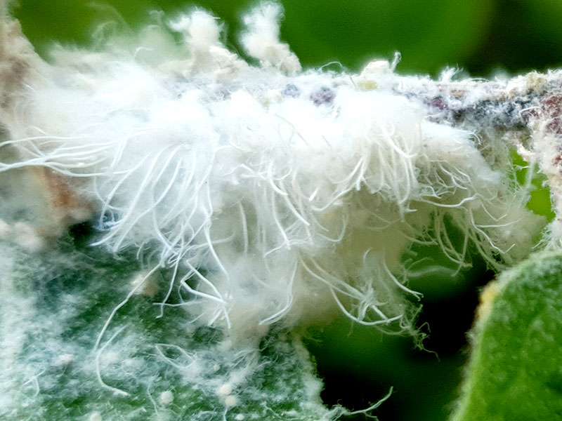 Jag fick ett par bilder av Linda hon tagit i helgen. Något vitt och hårigt/luddigt satt på undersidan av ett blad. Vi sökte efter något liknande på nätet. Gissningarna var att det var någon typ av svamp med mycel men det kändes inte riktigt rätt ändå. Vi noterade sedan det såg ut som att bladkanten där den satt var äten på och hittade till slut något liknande på en nordamerikansk sida.