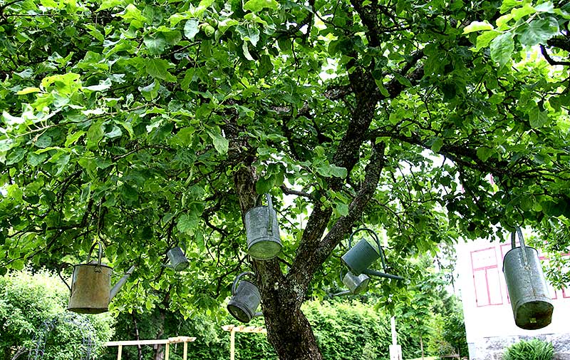 Jag letar trasiga kannor när jag går på loppis och antiklador när jag är på resa. De hänger jag upp i ett av äppelträden här i trädgården.
