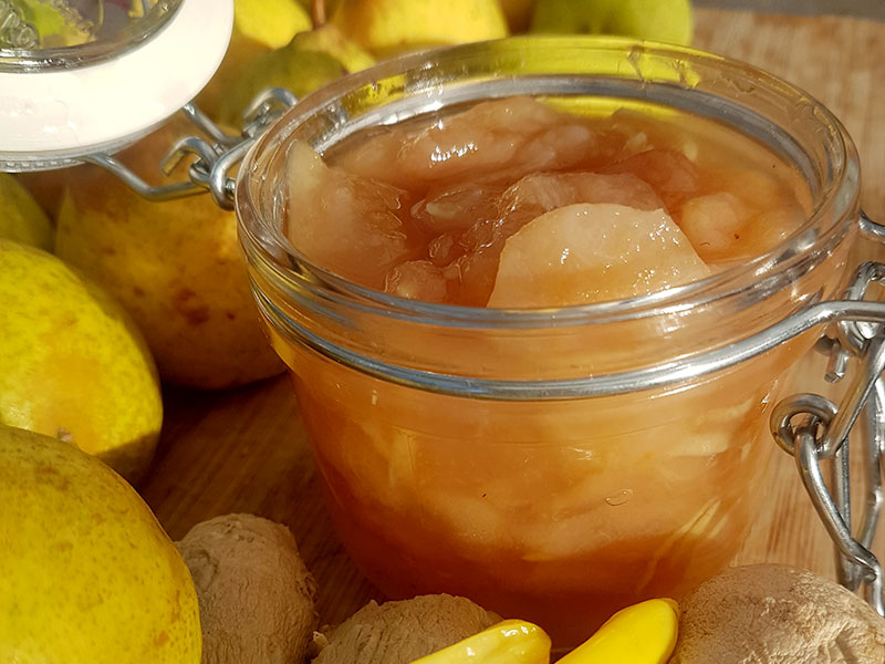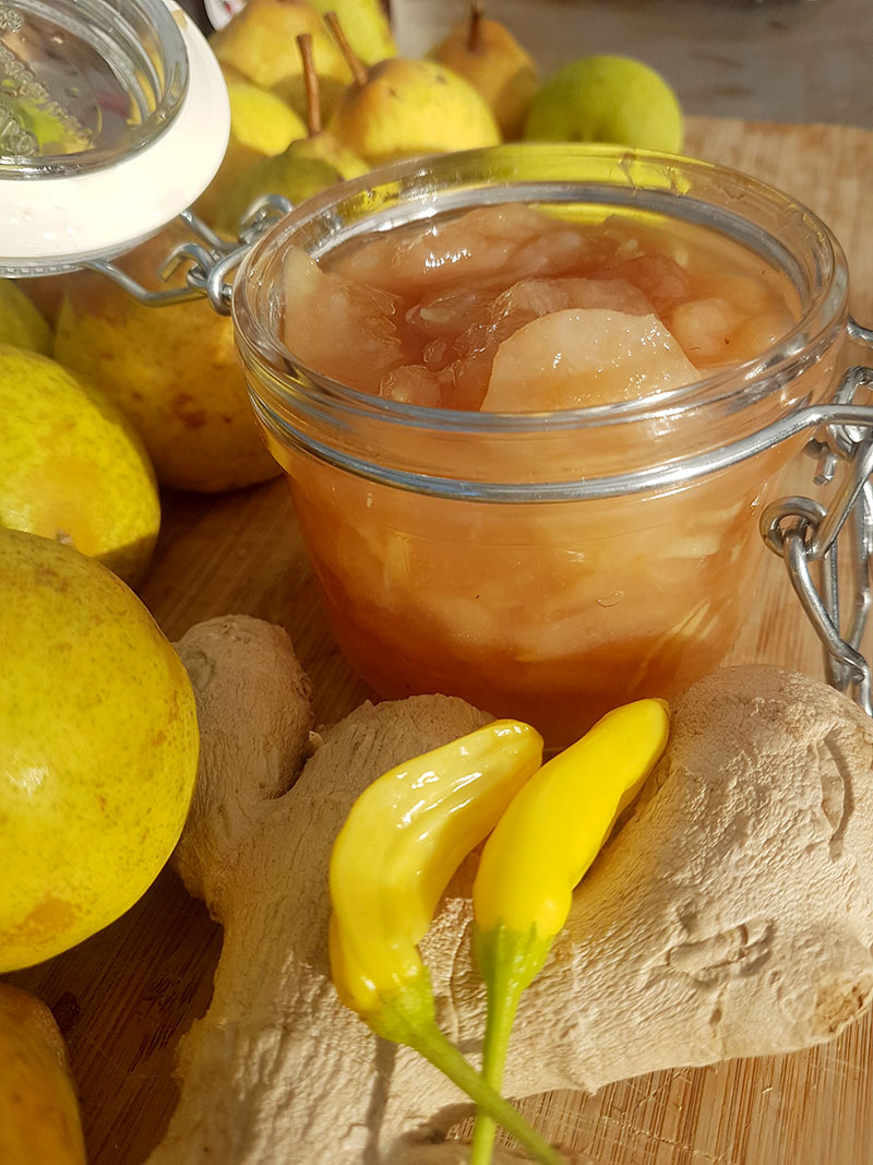 • Blanda i strimlad ingefära, finhackad chili, päronsprit och syltsocker.