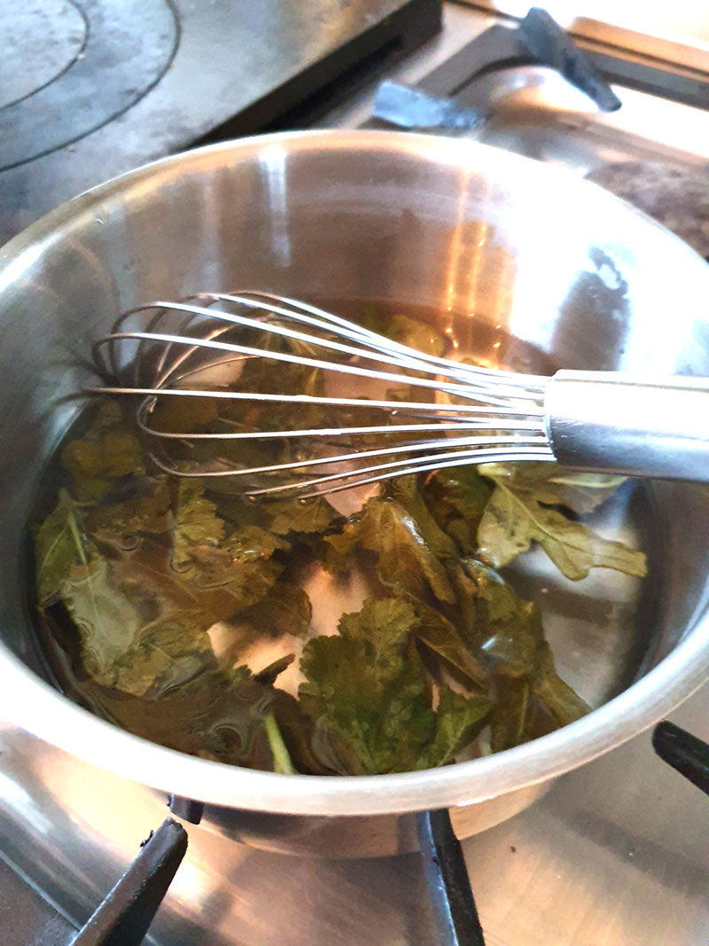 - Pressa bladen för att frigöra arom i vattnet med en träslev