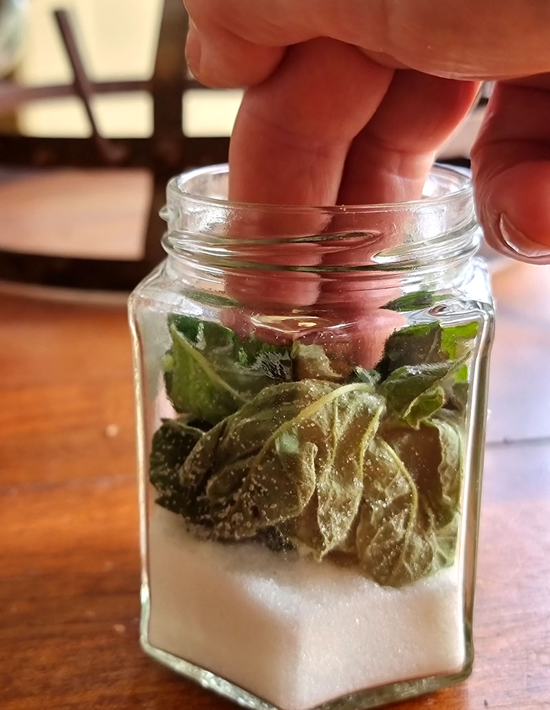 - Dela gärna bladen genom att dra isär dem så att saften av dem lättare tas upp i blandningen.