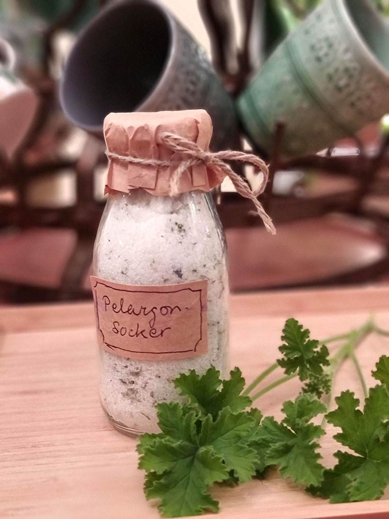 - Varva 2 dl strösocker med ca 8 färska blad av doftpelargon i en burk. Sorten 'Attar of Roses' är en favorit men prova gärna med andra sorter då det finns en bra bit över hundra att välja bland. Alla med lite olika doft.