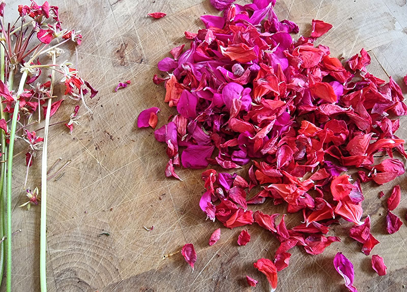 Har du torkade pelargonblad kan du använda dem för att göra pelargonsocker. Blanda då ca 1 del torkade, finmalda pelargonblad med 8-10 delar socker.