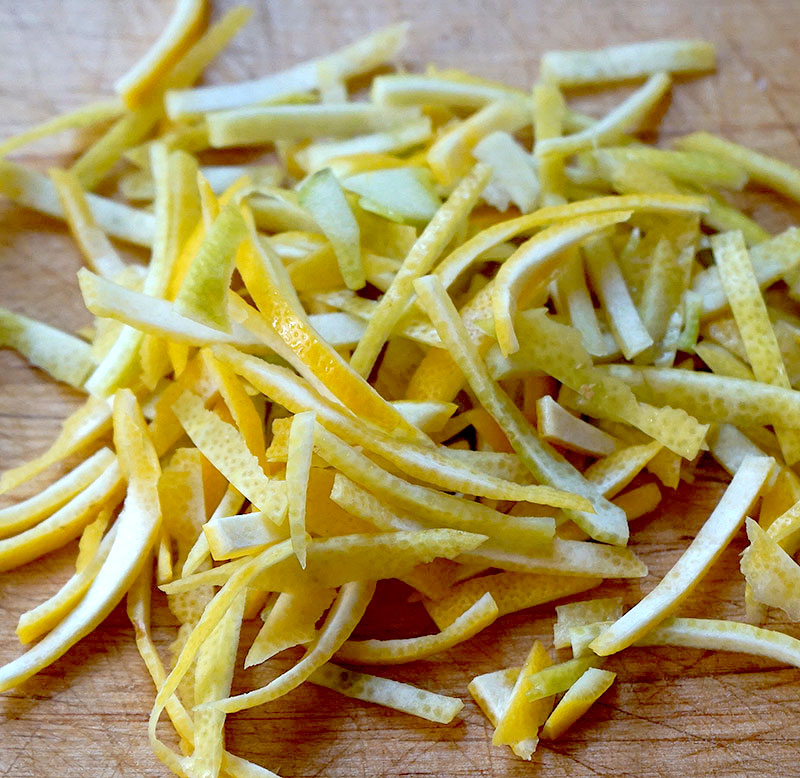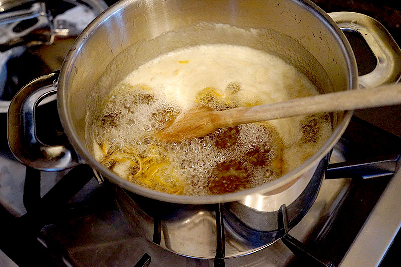 3. Blanda fläderblomssaft, socker och citronskal i en kastrull.