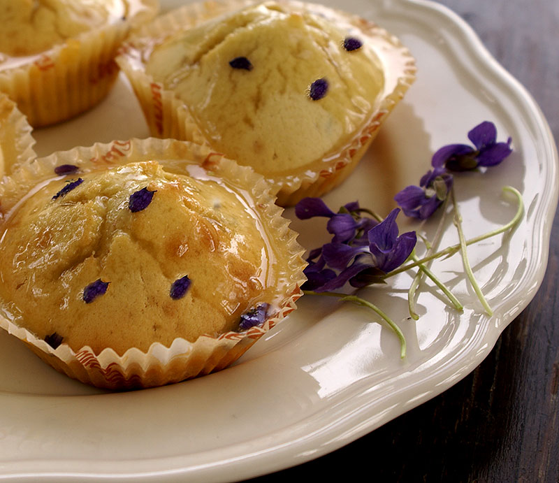 I muffinssmeten används violsocker som blandas ner med hela violblad för utseende och mer ännu mer violsmak.