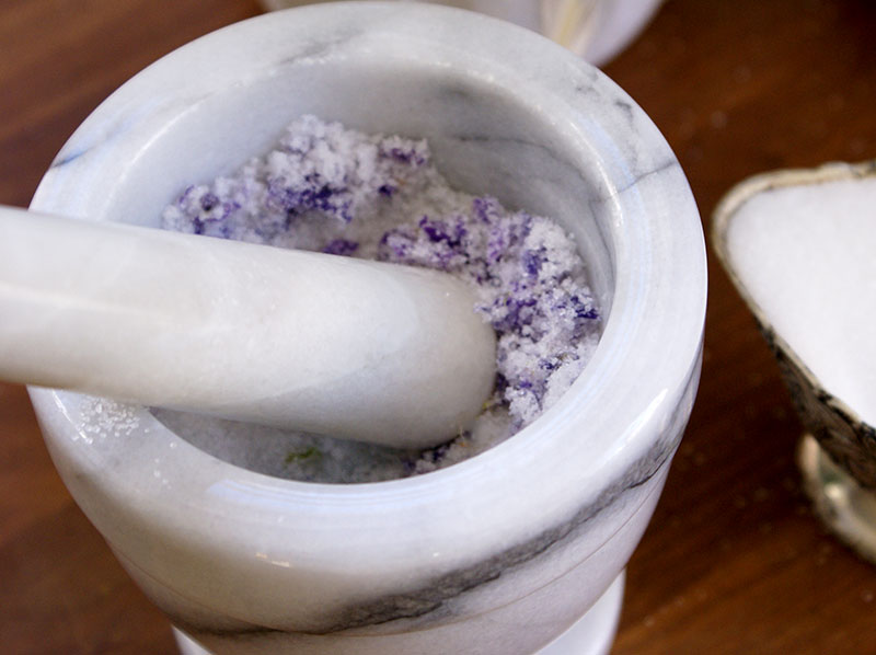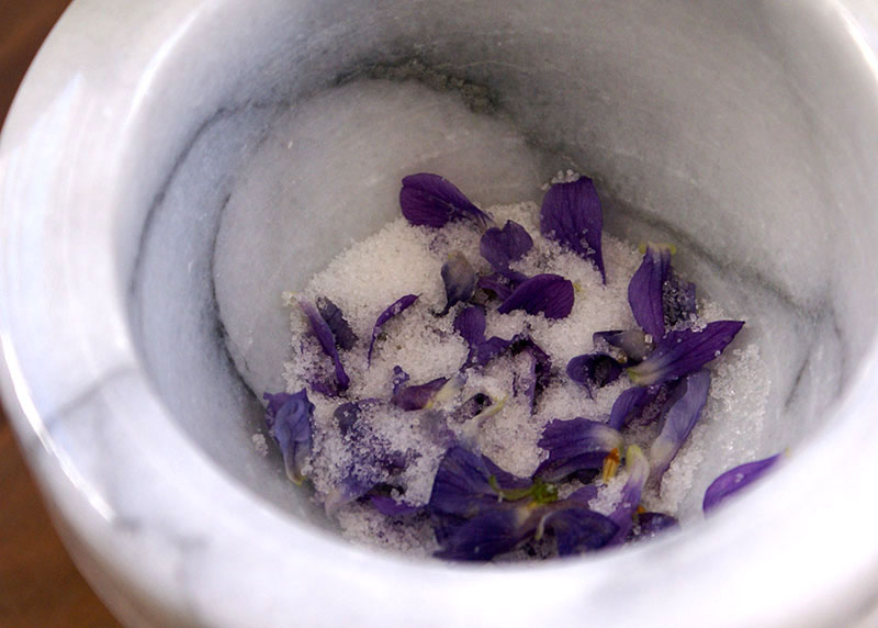Använd ca. 1/2 dl violer til 1 dl socker som mals och krossas samman i en mortel.