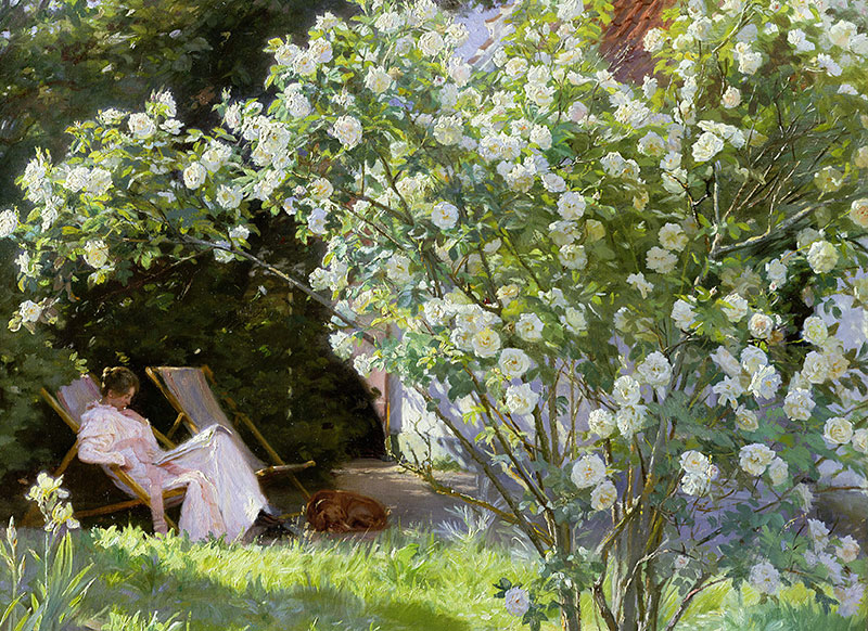 Skagenmålaren PS Krøyers målning ’Marie i trädgården’ är sinnebilden av vår längtan efter en avskild, kravlös oas. I fonden den lättskötta, skuggtåliga, härdiga, doftande rosen ’Alba Maxima’.