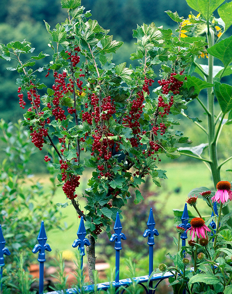 Bärbuskar är självklara i den ätbara täppan. Uppstammade vinbär blir både vackra och lättplockade.