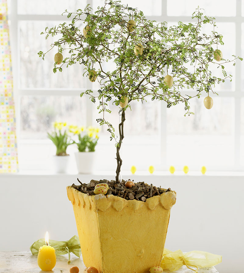 - Är läget blåsigt kan trädet behöva stadgas med extra stöd eller bindas till vägg eller räcke.