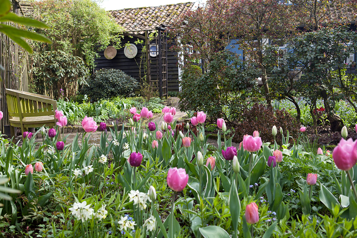 I större skala kan man avdela med häckar i olika nivåer (här bukettapel och nertill röd häckberberis), pergola, plank och slingerväxter. Rabatterna blir lättskötta med mycket lökväxter i kombination med marktäckande perenner.
