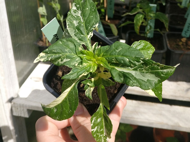 Vita eller ljusa blad kan bero på genetisk variegering – en egenskap hos sorten – eller tillfällig stress. Det är i många fall inte ett sjukdomstecken. Ibland kan svagt ljus, omplanteringsstress eller tidigare skador synas som ljusare partier.