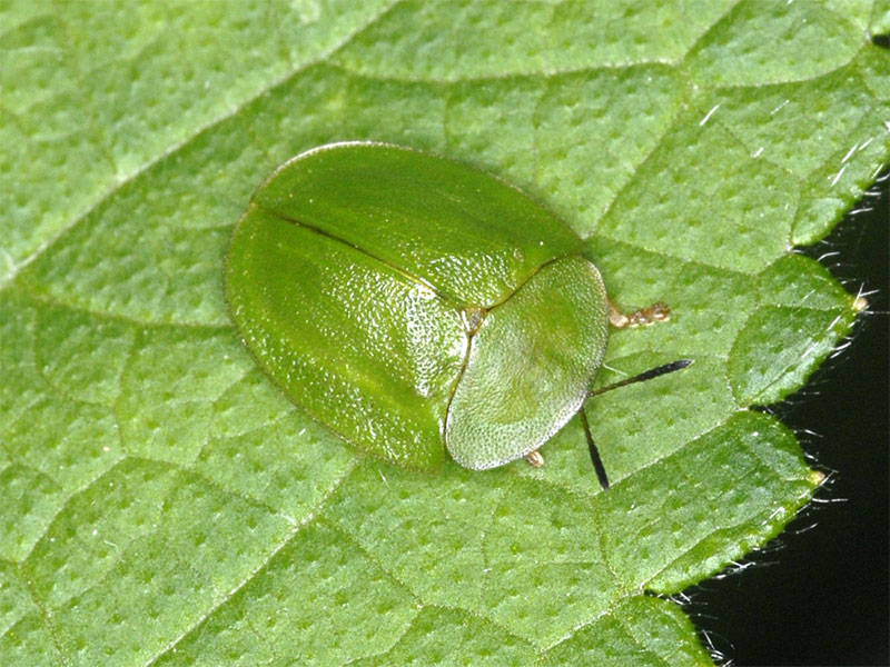 Den gröna sköldbaggen äter främst på olika slags mynta, citronmeliss och även gurkört.