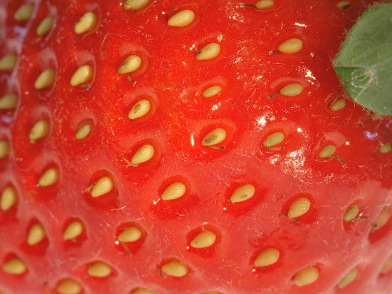 Jordgubbsfröna är botaniskt små nötter som sitter på en uppsvälld blombotten, så kallad skenfrukt. Varje fröämne måste pollineras för att bäret ska svälla till en jämn form.