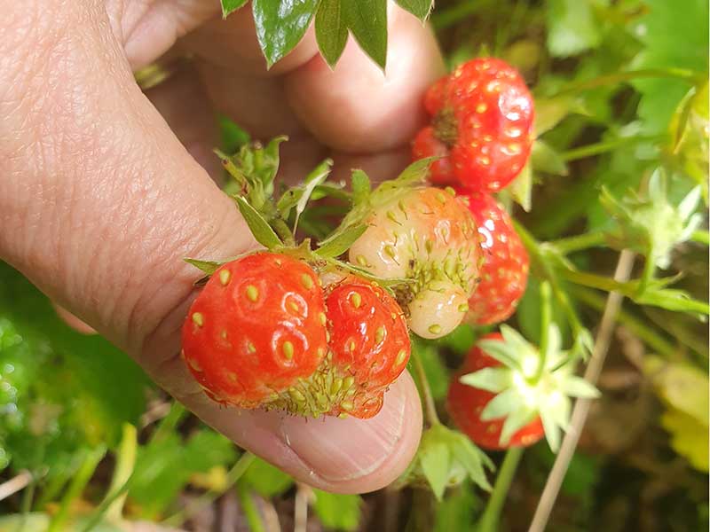 Kallt och regnigt väder vid blomningen ger också missformade bär. De ser mer oregelbundet buckliga vilket beror på dålig pollinering. Jordgubben är en så kallad skenfrukt. Själva fröet (alla de små hårda prickarna som sitter på skalet) är botaniskt en liten nöt som sitter på utsidan av den uppsvällda skenfrukten. Varje sådant litet fröämne måste pollineras för att bäret ska svälla till en jämn, fin form.