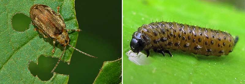 Efter ca 10 dagar är den fullbildade skalbaggen färdig, den är brun med långa antenner. Nu är det deras tur att kalasa på buskens nya blad. Under sensommaren lägger honorna ägg i toppskotten där de övervintrar.
