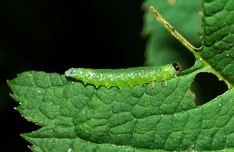 Fjärilslarven har på framkroppen kloförsedda, spetsiga bröstfötter. Dessutom har fjärilslarven högst fyra par bukfötter (de fötter som sitter kring magen och ser ut mer som sugkoppar). Huvudet är skilt från kroppen och har stora käkar på undersidan med bitande mundelar. Larverna bekämpas effektivt biologiskt med Larvskydd som vattnas ut.