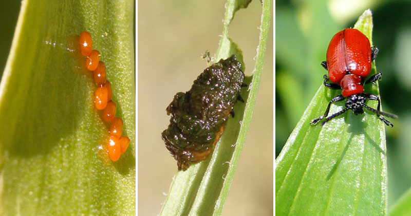 Liljebaggen kan flyga och är därför svår att fånga in. Då är det lättare att nitiskt plocka bort ägg och larver som sitter lite varstans på hela liljeväxten. Larverna lever i mörka klumpar.