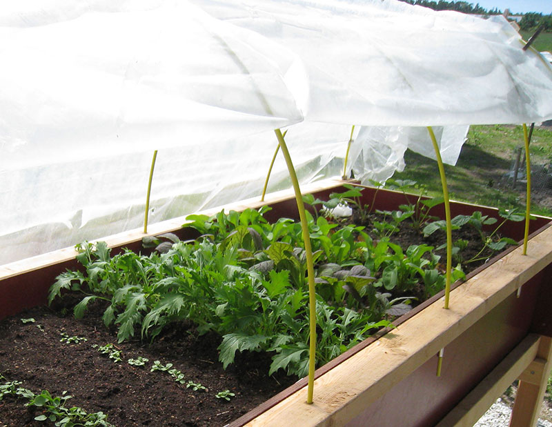 Med kålnät hindras flygande insekter att lägga ägg i grödorna. Odlingstunnlar på båge gör odlingen lättskött.