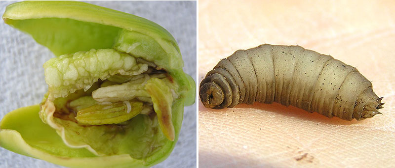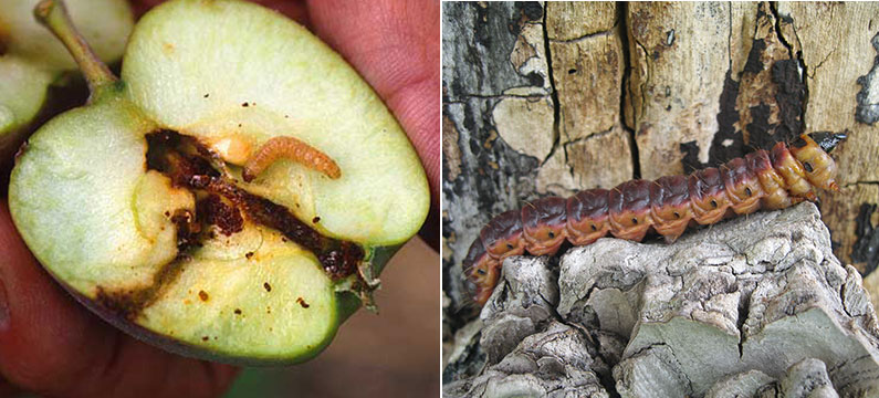 Till vänster: Vecklarlarver kan angripa både blommor, blad och frukter. I äpplen gör vecklarlarven en grov gång in till kärnhuset, till skillnad från rönnbärsmalen som gör många små gångar i hela frukten. Bekämpas med feromonfälla. TIll höger: Träd-ödarens 10 cm långa larv gnager på lövträd och lämnar efter sig ett gnagmjöl.