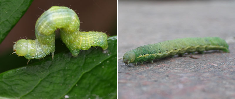 Till höger: frostfjärilens larv är en så kallad mätarlarv som viker sig upp för varje steg. TIll vänster: larv grönsaksfly gillar tomater, både blad och frukter slinker ner.