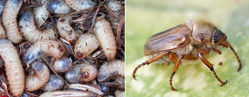 Bladhorningarnas larver lever i jorden där de äter på rötterna. Hit hör ollonborre, pingborre och trädgårdsborre. De behandlas effektivt biologiskt med NemaGräs som vattnas ut.