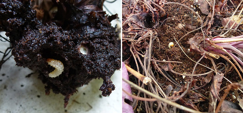 Öronvivelns larv härjar bland många trädgårdsväxter där den gnager på rötterna. Här en planta av alunrot, Heuchera, som mådde dåligt. På bladen syntes skalbaggens karaktäristiska kantgnag. När plantan grävs upp syns de små krumma larverna. Behandlas med nematoder mot öronvivel.