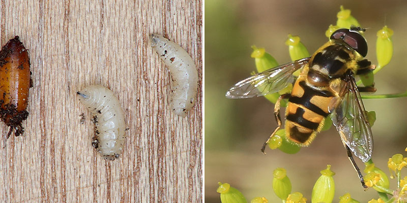 Blomflugan hör till trädgårdens vänner! Larverna är en av våra mest effektiva bladlössätare. De känns igen genom att framänden är något tillspetsad. Själva flugan är en duktig pollinerare. Den skiljs från getingar genom att den saknar midja.