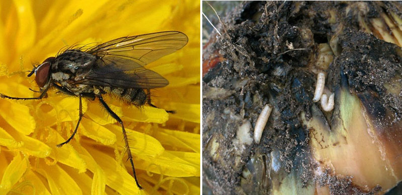 Lökflugans larver äter av både löken och rötterna så att plantan snabbt tacklar av.