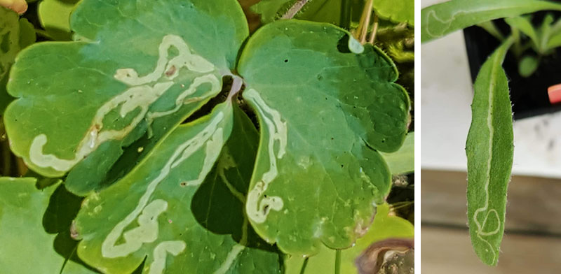 Minerarflugans larv gör karaktäristiska gångar i bladen. Här på akleja (tv) och blåklint (th).