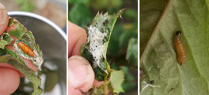 Det finns några arter av vecklarfjärilar vars larver går hårt åt rosblad och blomknoppar. Här olika stadier. Fån väster puppa och i mitten svarta avföringshögar och den vita väven som larven spinner i sig i vid förpuppning. Till höger larven med svart litet huvud. Bekämpas med handplockning och Larvskydd.