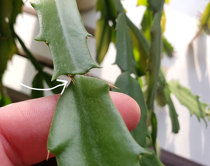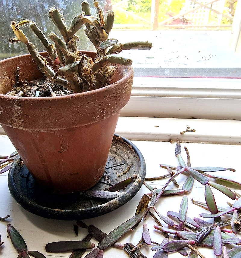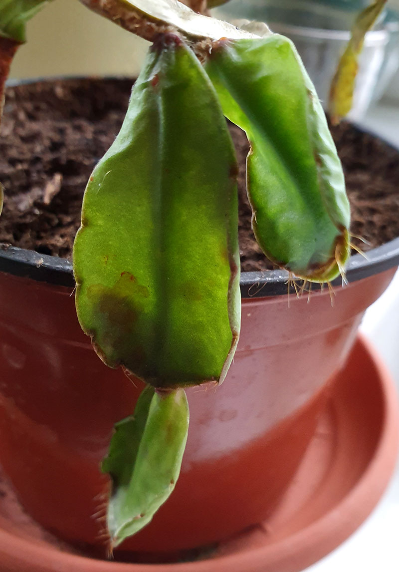 Ett tydligt tecken kan vara att det rasar blad från bladkaktusar på vintern med missfärgningar på stamdelar och bladens kanter.