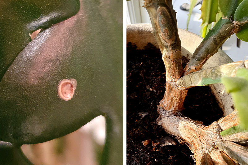 Här visas helt normala korkfläckar och förvedad, korkaktig stam hos bladkaktus som inte är angripen av falska spinn. Normalt åldrande och övertryck som bildar ödem. Inget som har med skadedjur att göra.