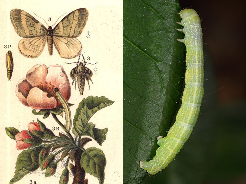 Frostfjärilen ställer till mest skada på fruktträd, där den äter av både blad och blomknoppar. TIll höger larven som har tre par tydliga bröstfötter och två par bukfötter.
