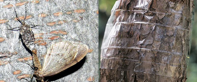 TIll vänster parning av den vinglösa honan och den bevingade hanen. Till höger en monterad limring som effektivt hindrar honan att krypa upp i trädet.
