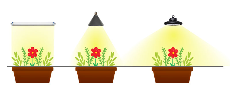 • Ljuset avtar med kvadraten på avståndet. Om man dubblerar avståndet så når bara 1/4 del så mycket ljus växterna. Det är därför viktigt att lampan kan hänga så nära som möjligt utan att bränna bladen. Använd gärna någon slags reflektor av folie eller skärmar, så att ljuset hamnar på växterna och inte går förlorat åt sidorna. För LED-lampor behövs ingen reflektor då detta ljus redan är riktat rakt fram. För LED-lampor med reflektor har denna mer en estetisk funktion, om man odlar i samma rum som man vistas i och inte vill bländas av ljuset.