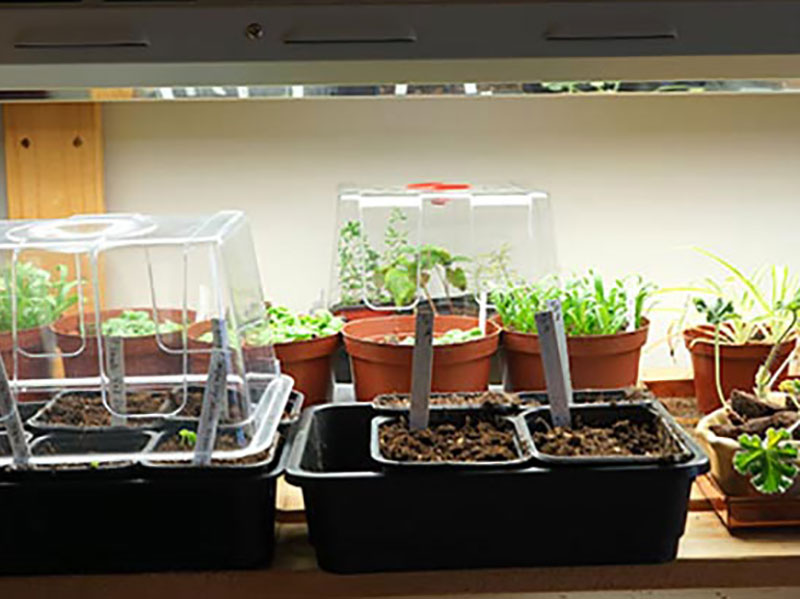 Lysrör (tv) och LED-lampor (th) dominerar växtlamporna. Lysrörerets kalla ljus liknar dagsljuset en sommardag. LED-lampan Primula Nova Grow 16W, silver varmare ljus passar för köksodlingen.