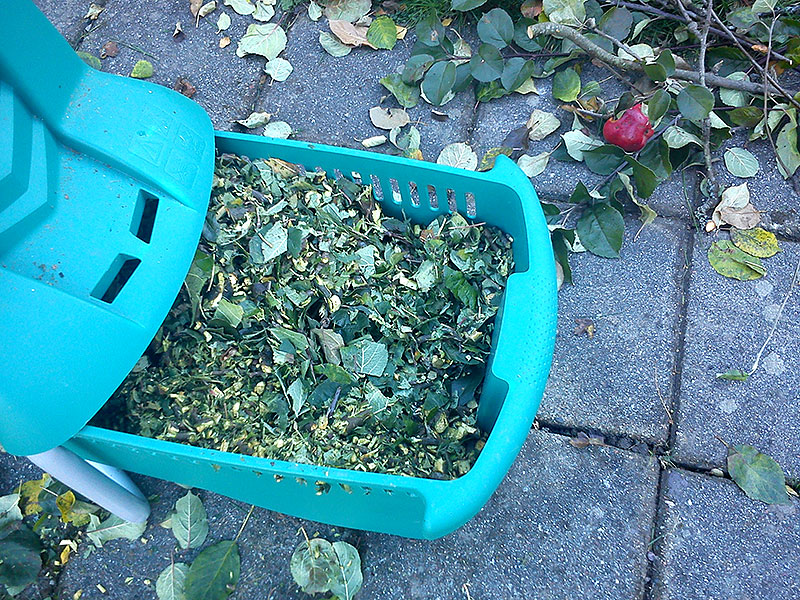 Finfördelade löv kan återanvändas direkt som täckmaterial eller lämnas kvar i gräsmattan på hösten för att tillföra mull.