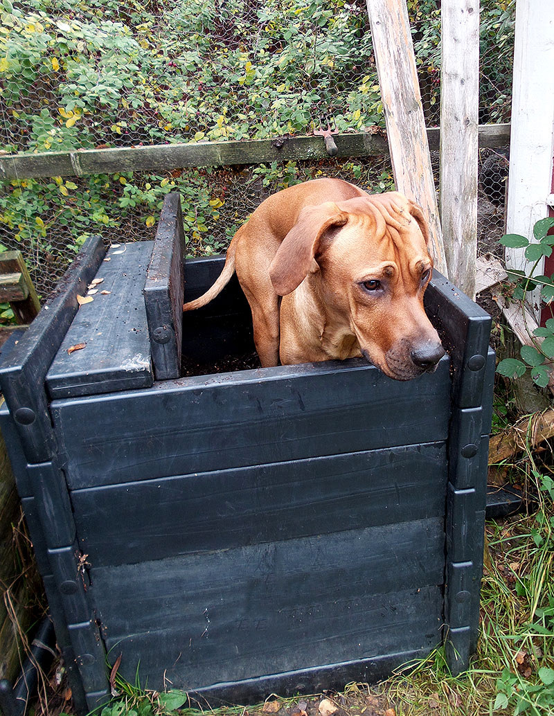 Hunden Spike gömmer sig i Varmkomposten Biokub