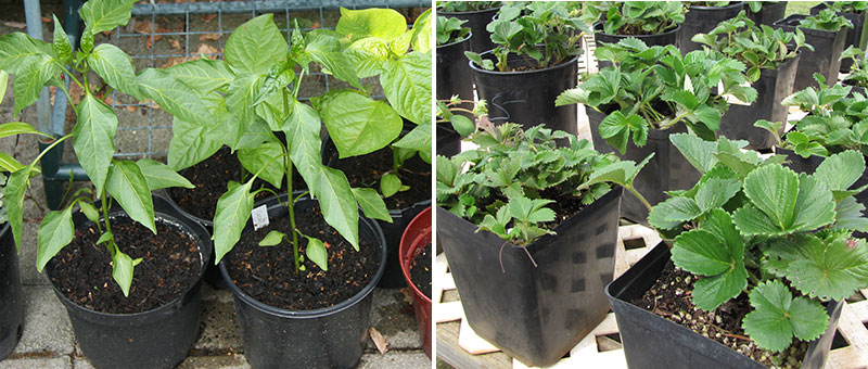 Slutmålet - fina, robusta plantor som kommer att ge skördar hela sommaren. TIll vänster chiliplantor i 10 liters krukor, till höger jordgubbsplantor i femliters krukor.