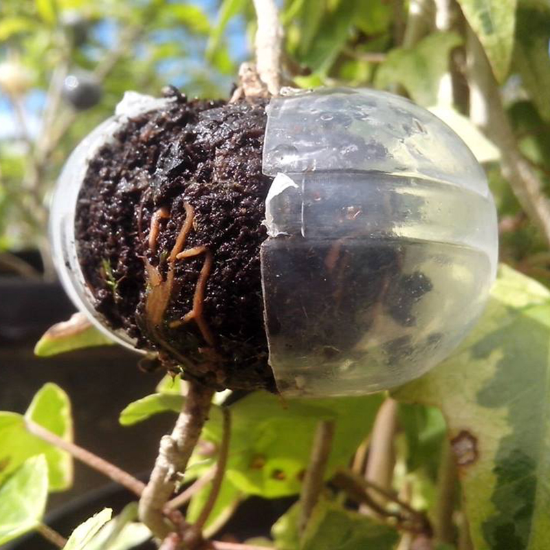 Sticklingsgloben är en fiffig konstruktion som håller ihop substratet kring stjälken. Här har man använt torv, med vitmossa hade rotningen gått ännu fortare med massor av vita, friska rötter.
