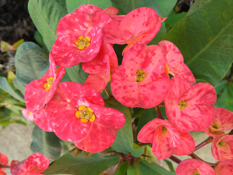 Fläckar på kronbladen är vanligen virus och inget att göra åt. Ibland kan det höja skönhetsvärdet som här på Kristi törnekrona.