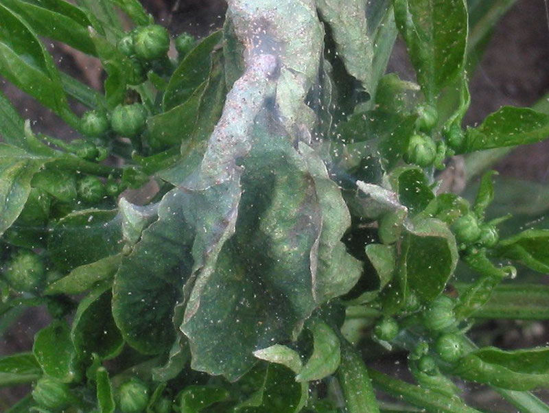 Krukväxter drabbas lätt av olika skadegörare. De svarta små prickarna avslöjar tripsens avföring. Likaså de silvriga fläckarna som uppstår när bladsaften sugits ut av tripsen och i stället fyllts med luft.
