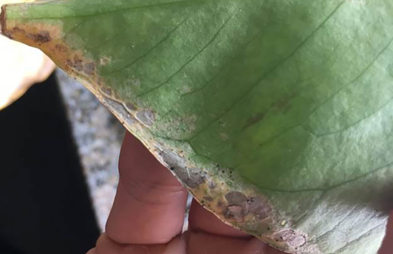 Svampsjukdom, kan bero på att fukt blir stående. Skär om möjligt bort det sjuka partiet. Behandla med Kumulus och stärk växten med kiselrik växtnäring. Låt jorden få torka upp ordentligt mellan vattningarna.