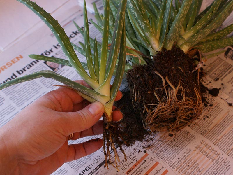Det är inte ovanligt att rötterna på huvudplanta och bladrosett vuxit ihop och gör det svårt att dela dem åt. Då får man ta i ordentligt men samtidigt vara försiktig genom att bryta och lirka lite i taget. Om det behövs kan man ta hjälp av en prickelpinne eller liten blomspade eller en gaffel för att försöka bryta isär plantan.