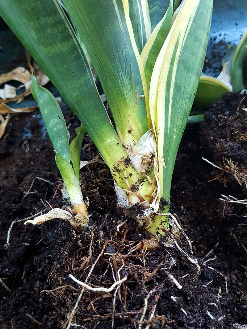 Huvudplanta med liten ny bladrosett hos Svärmors Tunga
