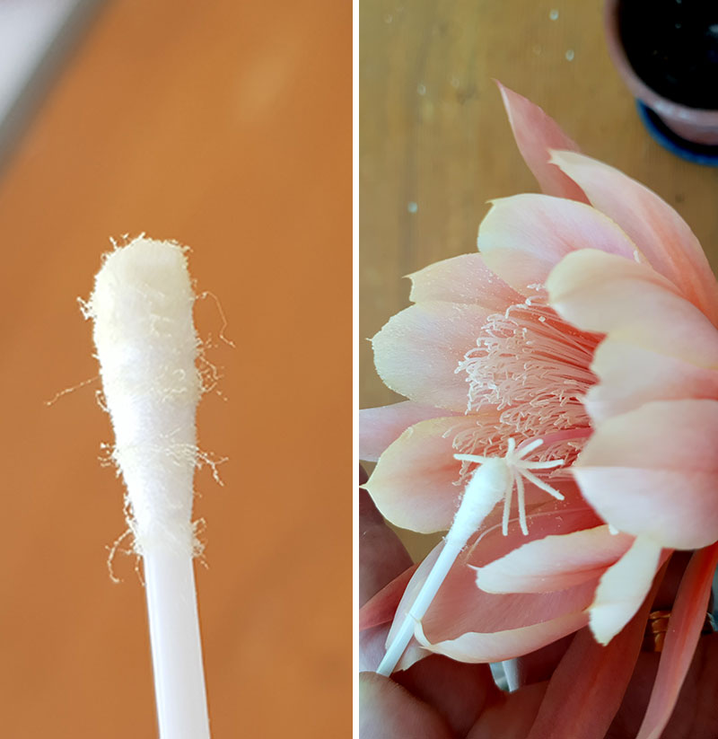 Med en fin pensel eller en bommulstops kan man föra pollen från en blomma till det klibbiga märket på pistillen.