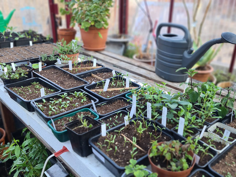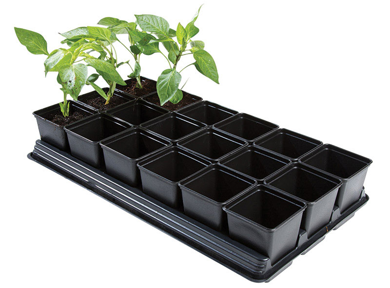 Ett lättskött och prydligt system med sju miniväxthus som kompletterats med en självvattnande matta.