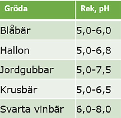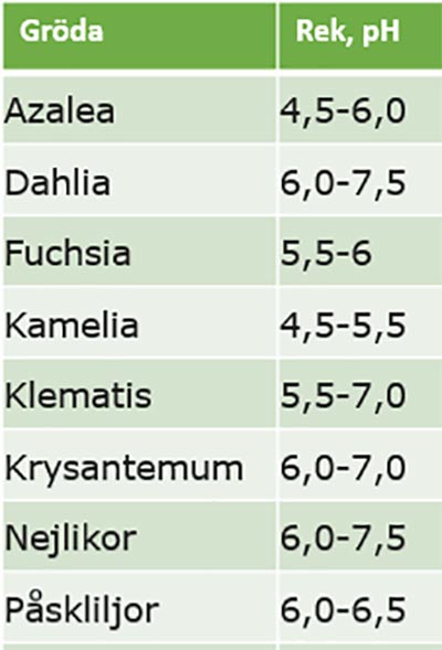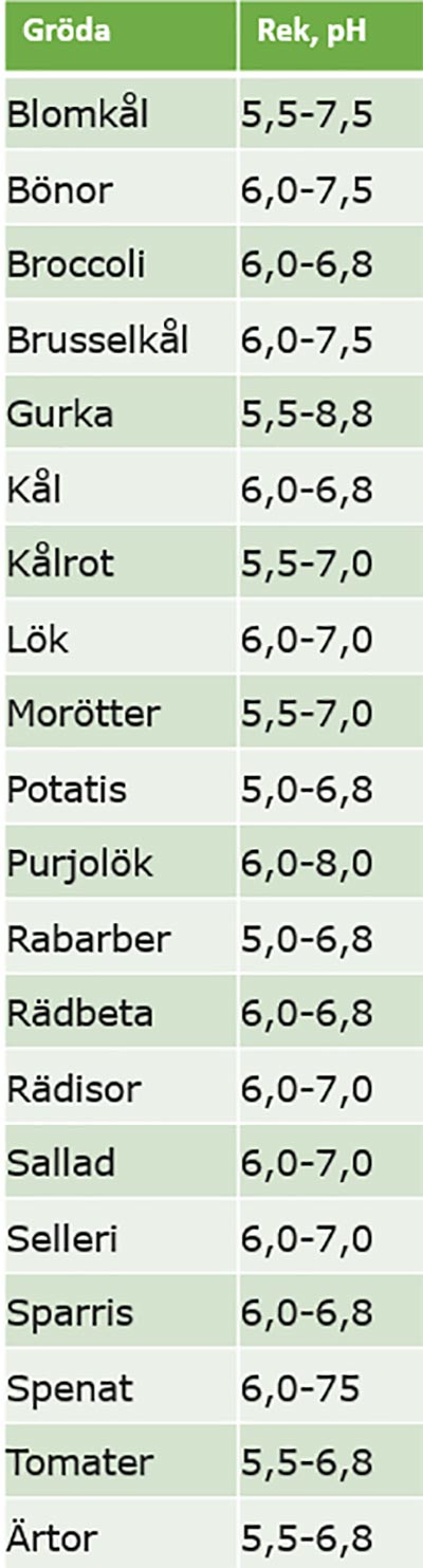 Här har vi sammanställt rekommendationer från en av våra engelska leverantörer för vilket pH som bäst passar olika slags gröda.