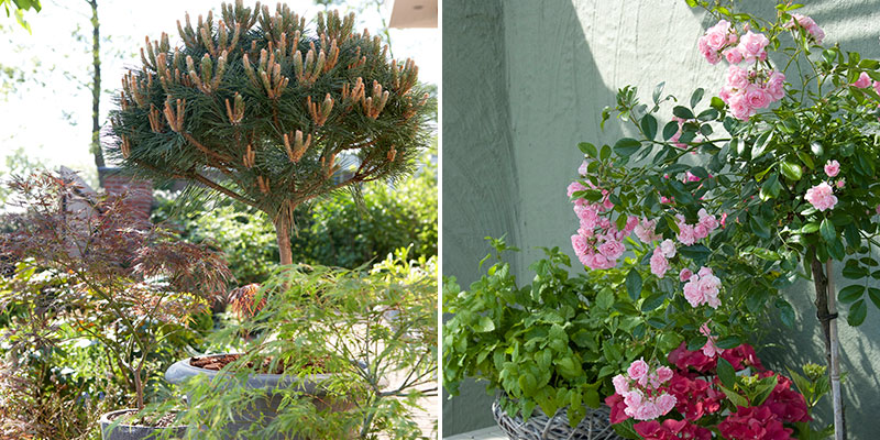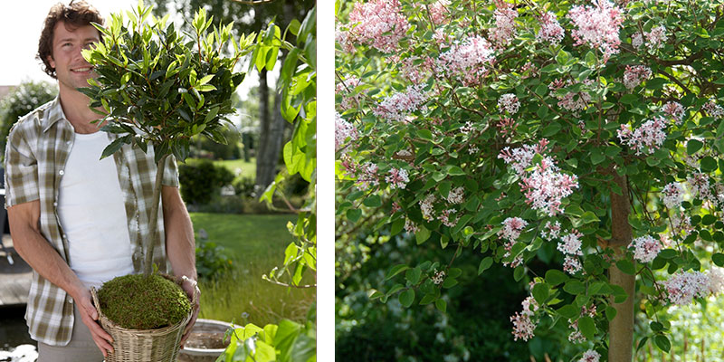 Fördelen med krukväxter (här lager) är att de kan ställas nära uteplatsen och passar perfekt på balkongen. Men krukan måste skyddas vinterid. Bild th: de små dvärgsyrenerna är ljuvliga att stamma upp.