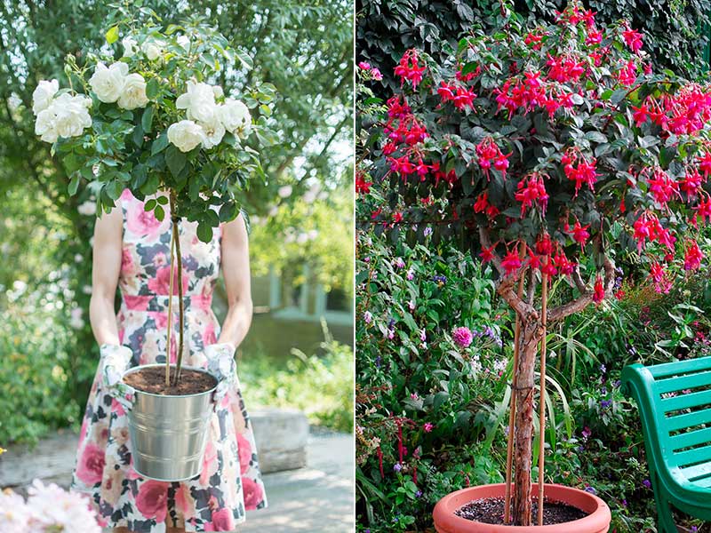 Rosenträd är fina på en vindskyddad plats. Rosor har ett djupt rotsystem, klipp in rötterna före plantering så kommer nya, livkraftiga rötter att etablera sig. Bild th: Fuchsior blir vackra små träd redan på en säsong. Stammen blir med åren charmigt knotig.